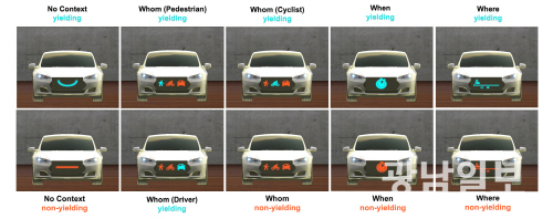연구팀은 이러한 문제를 해결하기 위해 ‘맥락 기반 eHMI’ 설계 방향을 제시하고, 자율주행차 외부 신호를 △신호 없음(No eHMI) △단순 양보 의사만 표시하는 기본 신호(No Context) △양보 대상 표시(Whom) △정지 시점 표시(When) △정지 위치 표시(Where) 등 다섯 가지 유형으로 구분해 효과를 비교했다.