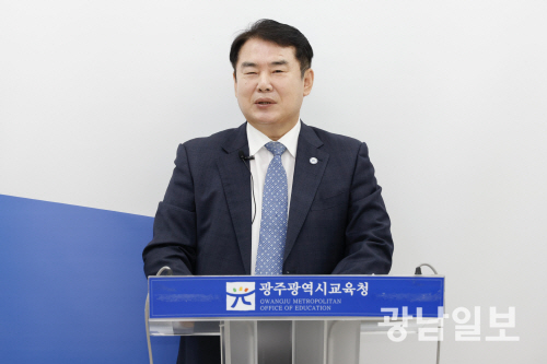 | 이정선 광주시교육감이 16일 교육청 브리핑룸에서 기자회견을 갖고 ‘기본교육특별시 광주’를 선언하고 있다. |