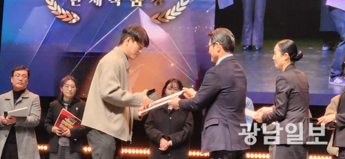 | 사단법인 한국연극협회가 주최한 ‘제63회 대한민국연극인축제 시상식’에서 김장균 연극문화공동체 DIC 대표가 베스트 단체작품상을 받고 있다. |
