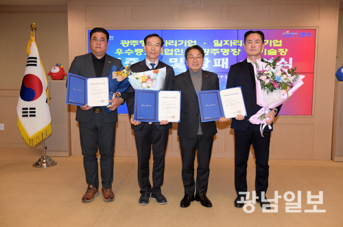 광주시는 16일 시청 비즈니스룸에서 광주형일자리기업 3개사, 일자리우수기업 16개사, 우수중소기업인 5명, 광주명장 1명, 기술장 3명에 대한 ‘인증서 및 상패 수여식’을 개최했다.