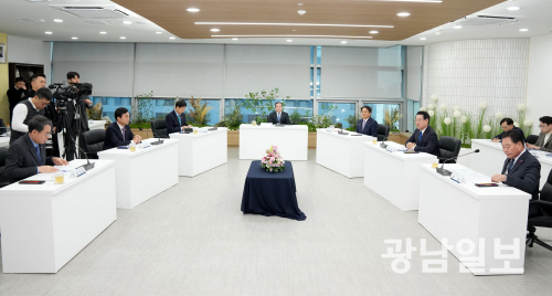 | 17일 오전 광주시 서구 광주도시공사에서 열린 ‘광주군공항이전 6자협의체’ 회의에 참석자들이인사말을 하고 있다. 왼쪽부터 강희업 국토교통부 제2차관, 안규백 국방부장관, 구윤철 기획재정부장관, 김용범 대통령비서실 정책실장, 강기정 광주시장, 김영록 전남도지사, 김산 무안군수. 최기남 기자 bluesky@gwangnam.co.kr |