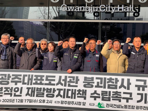 건설산업연맹 전국건설노동조합 광주전남건설지부 등은 17일 오후 광주 서구 광주시청 앞에서 ‘광주대표도서관 붕괴참사 규탄, 근본적인 재발방지대책 수립 촉구’ 기자회견을 열고 “광주시는 즉각 재발방지 대책을 마련하고, 노동조합, 사회단체, 전문가 등이 참여하는 안전대책위원회를 구성하라”고 밝혔다.