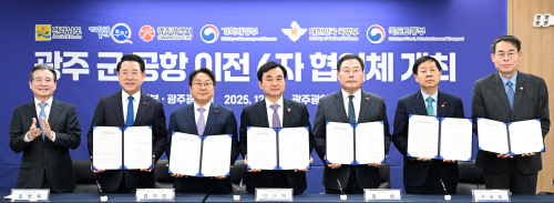| 17일 오전 광주 서구 광주도시공사에서 열린 광주군공항이전 6자협의체회의에 참석한 내빈들이 서명을 마친 광주군공항이전 관련 6자협의체 공동발표문을 들고 기념사진을 촬영하고 있다. 왼쪽부터 김용범 대통령비서실 정책실장, 김영록 전남도지사, 강기정 광주시장, 안규백 국방부장관, 김산 전남 무안군수, 구윤철 기획재정부장관, 강희업 국토교통부 제2차관. 광주전남사진기자단 |