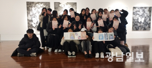 | 전시장을 방문한 광주예고 한국화 학생들과 기념 촬영에 나선 고 작가(두번째줄 왼쪽에서 세번째). |