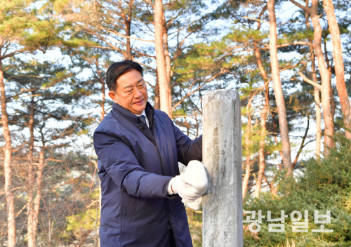 | 김한종 장성군수가 박수량 백비 참배를 마친 뒤 비석을 닦고 있다. |