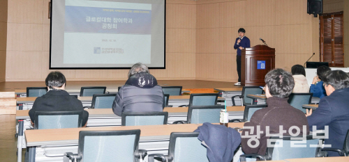 | 글로컬30추진본부 김석준 부본부장이 지난 18일 교내 입석홀에서 열린 ‘글로컬대학 참여학과 공청회’에서 발표하고 있다. |