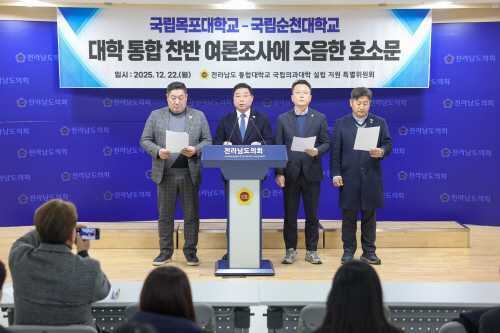 | 전남도의회 통합대학교 국립의과대학 설립 지원 특별위원회는 22일 전남도의회에서 국립목포대학교와 국립순천대학교 통합 여부를 묻는 찬반 투표에 대학 구성원들의 적극적인 참여를 촉구하는 호소문을 발표했다. |