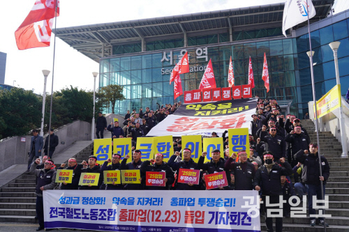 철도노조 호남본부(광주·전남·전북)는 22일 “정부의 성과급 정상화 약속 파기에 따라 23일 오전 9시부터 무기한 총파업에 돌입한다”고 밝혔다.