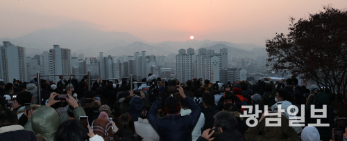 | 지난 2024년 1월 1일 광주 남구 월산근린공원에서 시민들이 새해 첫 해돋이를 감상하고 있다. |