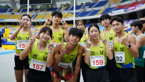 | ‘제106회 전국체육대회’에 출전한 전남 육상 선수들이 기념 촬영을 하고 있다. 사진제공=전남도체육회 |