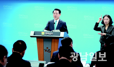 | 김영록 전라남도지사가 23일 도청 브리핑룸에서 2025년 송년 기자간담회를 갖고 민선 7~8기 주요 성과와 2026년도 도정방향에 대해 발표하고 있다. |