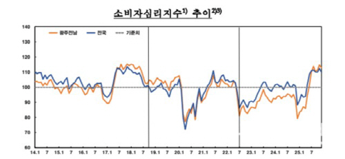 24일 한국은행 광주전남본부가 발표한 ‘2025년 12월 광주·전남지역 소비자동향조사’ 결과에 따르면 소비자심리지수(CCSI)는 112.9로 전월보다 1.8p 하락했다. 이는 전국 평균(109.9)보다는 높은 수준이다.