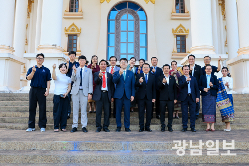 | 라오스디지털문화자원관리시스템 이양식에 참석한 주요 관계자들이 기념사진을 찍고 있다. |