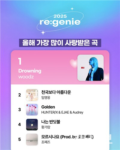 KT지니뮤직은 “1위 ‘드라우닝’은 지난 2023년 발매된 곡이지만 차트 역주행을 통해 올해 최고 인기곡으로 등극했다”고 소개했다.