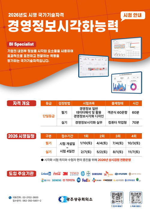 광주상공회의소는 2026년 1월부터 국가기술자격 경영정보시각화능력(BI Specialist) 시험을 기존 정기검정 방식에서 상시검정 방식으로 전면 전환한다고 24일 밝혔다.