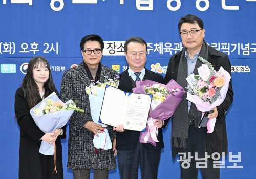 | 23일 오후 광주 서구 풍암동 염주체육관 내 올림픽기념국민생활관에서 열린 ‘2025 제14회 중소기업 경영인 대상’ 시상식에서 종합대상 중소벤처기업부 장관상을 수상한 허승업 ㈜삼우산업대표(왼쪽 네번째)와 직원들이 기념촬영을 하고 있다. |