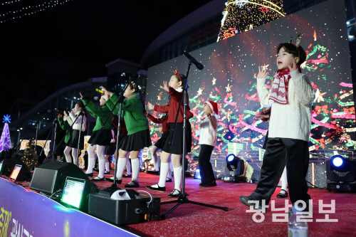 광주 광산구(구청장 박병규 )가 지난 25일 광주송정역 광장에서 시민과 연말의 따뜻함을 나누는 ‘12월 가장 예쁜 역 축제’를 개최했다. 이날 열린 축제에서 어린이 중창단의 공연이 펼쳐지고 있다. 광주 광산구는 광주송정역 일대를 시민이 머무는 겨울철 대표 명소로 만들기 위해 ‘성탄문화축제와 함께하는 12월 가장 예쁜 역’ 사업을 실시해 선물 상자, 산타 집, 루돌프가 끄는 산타 마차 등 다양한 빛 조형물로 가득한 ‘광산의 겨울 정원’으로 꾸며, 연말연시 따뜻한 분위기를 만끽할 수 있는 특별한 공간을 마련했다.