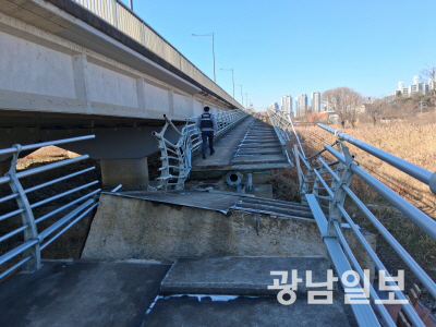 28일 광주시 등에 따르면 이날 오후 12시 10분께 서구 덕흥동 광신대교 옆 보행교가 무너졌다는 신고가 112상황실에 접수됐다.