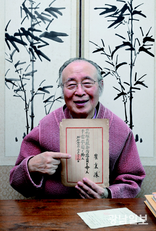 | 민족문제연구소 지도위원이자 식민지역사박물관 명예관장인 심정섭씨가 28일 ‘이화명충 구제 지도원 임명장’과 ‘소나무 쐐기나방 유충 공동 구제 출역 통지서’를 본보에 독점 공개했다. 최기남 기자 bluesky@gwangnam.co.kr |