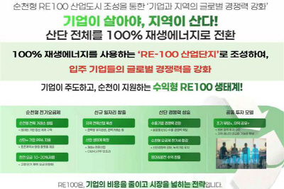 순천시 관계자는 “RE100 산업단지는 지역 수출기업의 경쟁력과 지역의 재생에너지 자원 활용을 연결해 지역경제 부흥으로 귀결될 중요한 과제다”며 “순천시의 역량을 결집해 착실히 추진해 나가겠다”고 말했다.