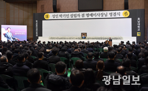 | 성인학원 호남대학교 설립자 겸 명예이사장인 고 박기인 박사 영결식이 28일 오전 교내 문화체육관에서 학교장으로 엄수됐다. |