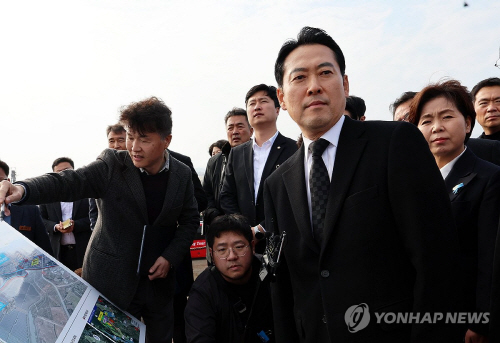| 국민의힘 장동혁 대표(가운데)가 29일 오후 전남 현안 사업 현장인 해남군 산이면 솔라시도를 시찰하고 있다.(연합) |