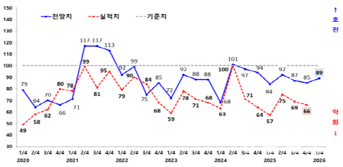 29일 광주상공회의소에 따르면 지역 120개 제조업체를 대상으로 실시한 ‘2026년 1분기 기업경기실사지수(BSI)’조사 결과, 전 분기(85) 대비 4p 상승한 ‘89’로 집계됐다. 다만, BSI 기준치인 100에는 여전히 못 미쳐 다음 분기 경기를 낙관적으로 보는 기업보다 비관적으로 보는 기업이 더 많다는 의미다.