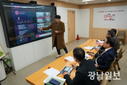 | 광주 동구는 29일 청사 3층 접견실에서 ‘금남로 차 없는 거리’ 연구용역 최종보고회를 개최했다. 사진은 임택 청장과 직원들이 ‘차 없는 거리’ 성과를 살펴보는 모습. |