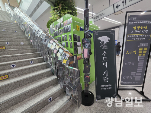 | 무안국제공항 1층에서 2층으로 이어진 추모의 계단에는 추모객의 손편지가 가득했다. |