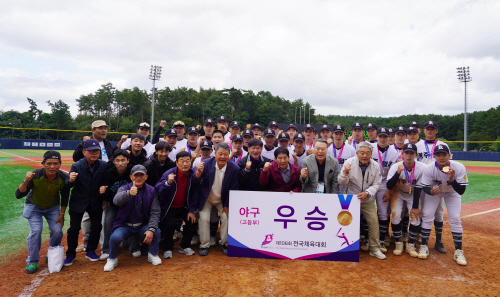 | ‘제106회 전국체육대회’ 야구 고등부에서 우승을 차지한 광주일고 선수단과 관계자들이 기념 촬영을 하고 있다. 사진제공=광주시체육회 |
