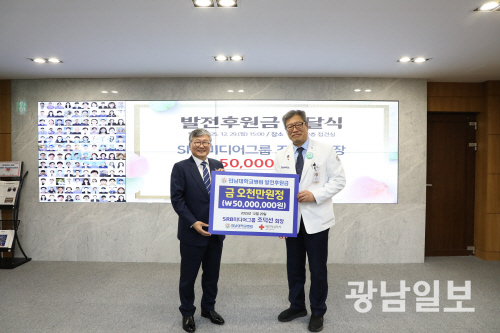 | 조덕선 SRB미디어그룹 회장이 정신 전남대병원장에게 발전후원금을 5000만원을 전달하고 있다. |