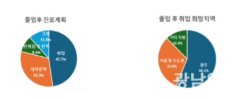 취업을 희망하는 학생들 가운데 56.1%는 희망 근무 지역으로 ‘광주’를 선택해 지역 정착 의지가 비교적 높은 것으로 조사됐다. 그러나 나머지 43.9%는 타지역 취업을 고려하고 있어 직업계고 인재의 지역 이탈 가능성도 여전히 상존하는 것으로 분석됐다.