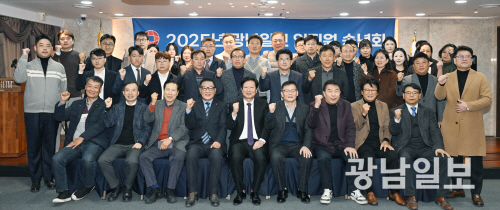 | 지난 29일 오후 광주 동구 호텔아트하임 대연회장에서 열린 광남일보 ‘2025 임직원 송년회’에 참석한 양진석 회장과 이승배 사장 등 임직원들이 파이팅을 외치며 기념 촬영을 하고 있다. 송년회는 개회식을 시작으로 독자 확장 캠페인 우수 사원 시상, 신규 임직원 소개, 기념촬영, 만찬 순으로 진행됐다. 최기남 기자 bluesky@gwangnam.co.kr |