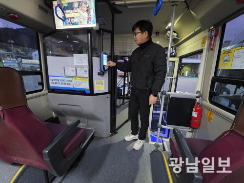 | 한 시민이 송암 31번 시내버스에 탑승한 뒤 단말기에 교통카드를 찍고 있다. |