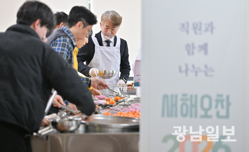 | 떡국 배식 봉사하는 김이강 서구청장 김이강 서구청장이 2일 오전 2026년 병오년(丙午年)시무식 후 청사 구내식당에서 직원들에게 떡국 등 점심식사 배식 봉사활동을 펼치고 있다. 최기남 기자 bluesky@gwangnam.co.kr |