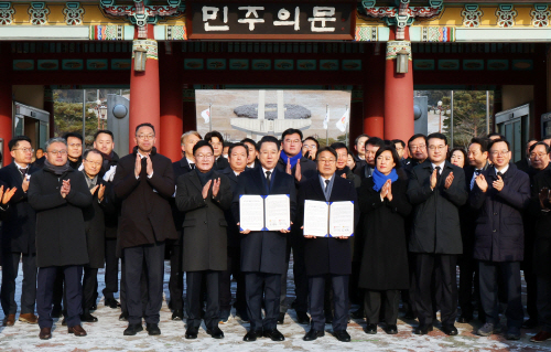| 2일 오전 광주 북구 운정동 국립 5·18 민주묘지에서 강기정 광주시장·김영록 전남지사가 광주·전남 행정통합 선언문을 발표한 뒤 기념사진을 찍고 있다. |