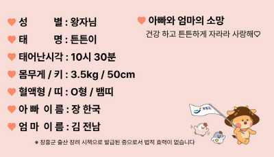 장흥군 관계자는 “아기 주민등록증을 통해 아이의 출생을 기념하며, 가족들에게 따뜻한 추억이 되길 바란다”며 “앞으로도 다양한 출산 장려 정책을 마련해 아이 키우기 좋은 장흥을 만들겠다”고 말했다.