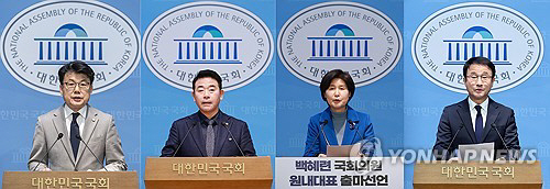 | 오는 11일 치러지는 4개월 임기의 더불어민주당 원내대표 보궐선거에 3선 의원 4명이 출마해 4파전 구도가 형성됐다. 사진은 왼쪽부터 출마 기자회견에 나선 진성준·박정·백혜련·한병도 의원.(연합) |