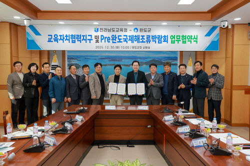 | 완도군은 최근 전남도교육청과 교육자치협력지구의 원활한 사업 운영과 2026 Pre완도국제해조류박람회 협력 체계 구축을 위한 업무협약을 체결했다. |