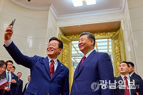 | 이재명 대통령과 시진핑 국가주석이 5일 중국 베이징 인민대회당에서 국빈만찬 후 샤오미폰으로 기념촬영을 하고 있다. 이 샤오미폰은 경주 정상회담 때 시 주석이 이 대통령에게 선물한 것이다.(연합) |