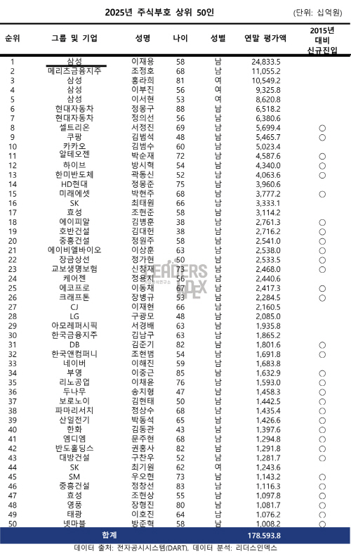 6일 기업분석연구소 리더스인덱스가 국내 주식자산 부호 현황을 조사한 결과, 상위 50명 가운데 창업부호는 2015년 12월 30일 11명에서 2025년 12월 30일 24명으로 10년 동안 2.2배가 늘어난 것으로 확인됐다. 창업부호 비중도 22%에서 48%로 높아져 절반에 육박했다.