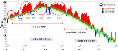 북태평양고기압이 평년보다 빠르게 확장해 6월 중반부터 폭염과 열대야가 발생하며 이른 더위가 시작됐고, 10월까지 북태평양고기압 영향으로 습한 공기가 유입돼 높은 기온이 지속됐다.