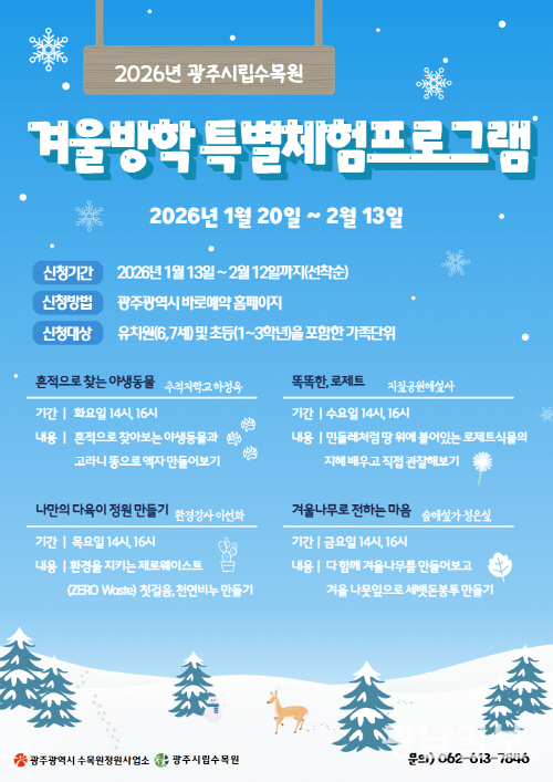 김희석 수목원·정원사업소장은 “이번 겨울방학 특별체험 프로그램을 통해 아이들이 자연을 관찰하고 체험하며 자연에 대한 친근감을 키우길 바란다”며 “앞으로도 시민들이 참여할 수 있는 다양한 프로그램을 지속적으로 운영하겠다”고 말했다.