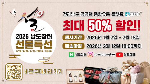 남도장터는 지난해 기세를 이어 설 명절 기획전을 전개한다. 2월 18일까지 물가 부담은 낮추고 농가 소득은 높이는 상생 기획전으로, 270개 업체 1400여개 품목이 참여해 전 품목 20% 기본 할인과 설 선물 전용관 품목 최대 50%까지 할인가로 제공한다. 1인당 최대 30만원의 할인 쿠폰과 대량 구매 시 최대 15% 추가 할인 등 풍성한 혜택이 마련됐다.
