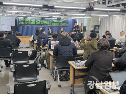 현장 노동자들은 공기 압박이 곧 안전 붕괴로 이어진다고 호소했다. 토론자로 참석한 이승철 민주노총 광주전남건설지부 형틀1분회장은 “혹서기·혹한기로 공사가 중단돼도 공기는 줄어들지 않는다”며 “공기 지연에 따른 위약금은 하청업체와 노동자에게 떠넘겨지고 있다”고 밝혔다. 그는 “고용 구조가 개선되지 않는 한 건설 현장의 사고는 반복될 수밖에 없다”고 말했다.