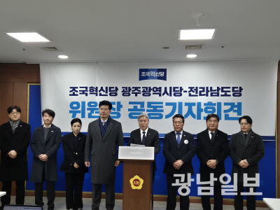 | 8일 조국혁신당 광주시당과 전남도당은 광주시의회에서 기자회견을 열고 광주·전남 행정통합의 속도감 있는 추진과 명확한 청사진 제시를 요구했다. |