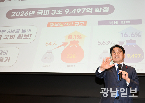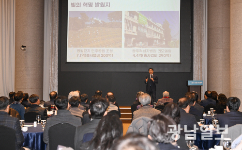 | 광주경총 금요조찬포럼 특강하는 강기정 시장 9일 오전 광주 서구 치평동 홀리데이인광주호텔에서 열린 광주경영자총협회 금요조찬포럼에서 강기정 광주시장이 ‘광주·전남 대통합 부강한 광주의 확장’에 대해 특강을 하고 있다. 최기남 기자 bluesky@gwangnam.co.kr |