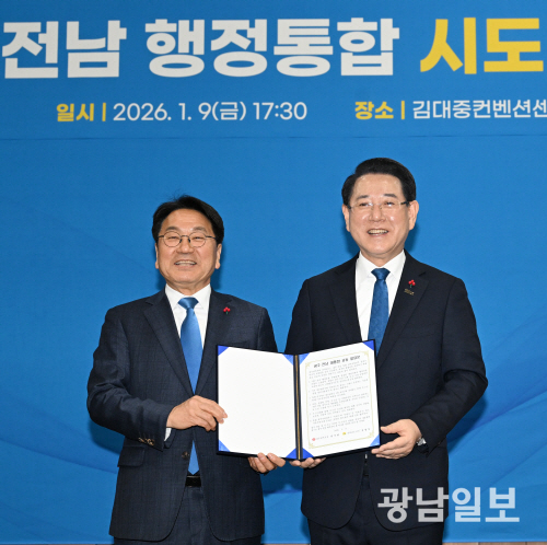 | 광주·전남 행정통합 시도민 보고회’ 9일 오후 광주 서구 치평동 김대중컨벤션센터에서 열린 ‘광주·전남 행정통합 시도민 보고회’에 참석한 강기정 광주시장과 김영록 전남도지사가 기념촬영을 하고 있다. 최기남 기자 bluesky@gwangnam.co.k |