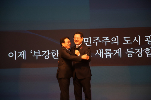 | 강기정 광주광역시장이 11일 김대중컨벤션센터에서 열린 ‘광주, 처음보다 더 극적인 두 번째 등장’ 출판기념회에서 김영록 전남지사와 포옹하고 있다. |