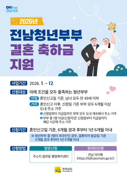 결혼축하금은 주소지 관할 읍·면·동 행정복지센터를 방문해 신청하거나 전남 아이톡에서 온라인으로 접수하면 된다.